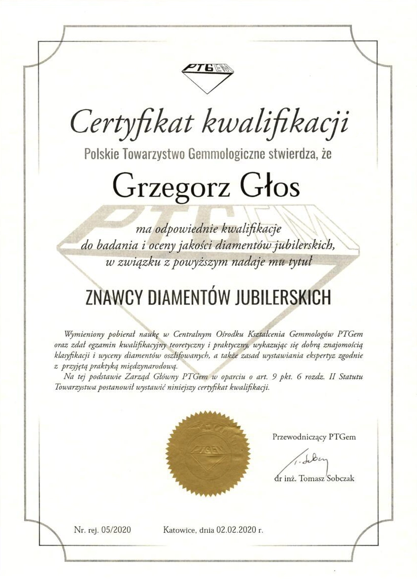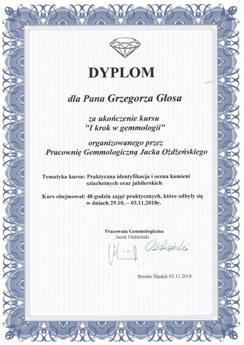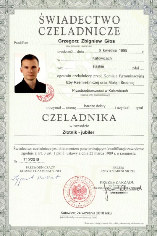 Jestem dyplomowanym mistrzem w zawodzie Złotnik-Jubiler, tytuł ten uzyskałem po wieloletniej praktyce oraz zdaniu egzaminów czeladniczego i mistrzowskiego. Ukończyłem Ogólnokształcącą Szkołę Sztuk Pięknych w Katowicach, zdobywając tytuł plastyka ze specjalizacją w formach rzeźbiarskich. Swoje umiejętności rozwijałem również poprzez liczne specjalistyczne szkolenia z zakresu oprawy kamieni, nowoczesnych technologii jubilerskich oraz gemmologii. Jestem dyplomowanym rzeczoznawcą diamentów oraz ekspertem kamieni naturalnych kolorowych, które osobiście selekcjonuję i sprowadzam z całego świata. Jestem członkiem Śląskiego Cechu Złotników, Jubilerów i Grawerów oraz Izby Rzemieślniczej i MŚP w Katowicach, która uhonorowała mnie Honorową Odznaką Rzemiosła Śląskiego.