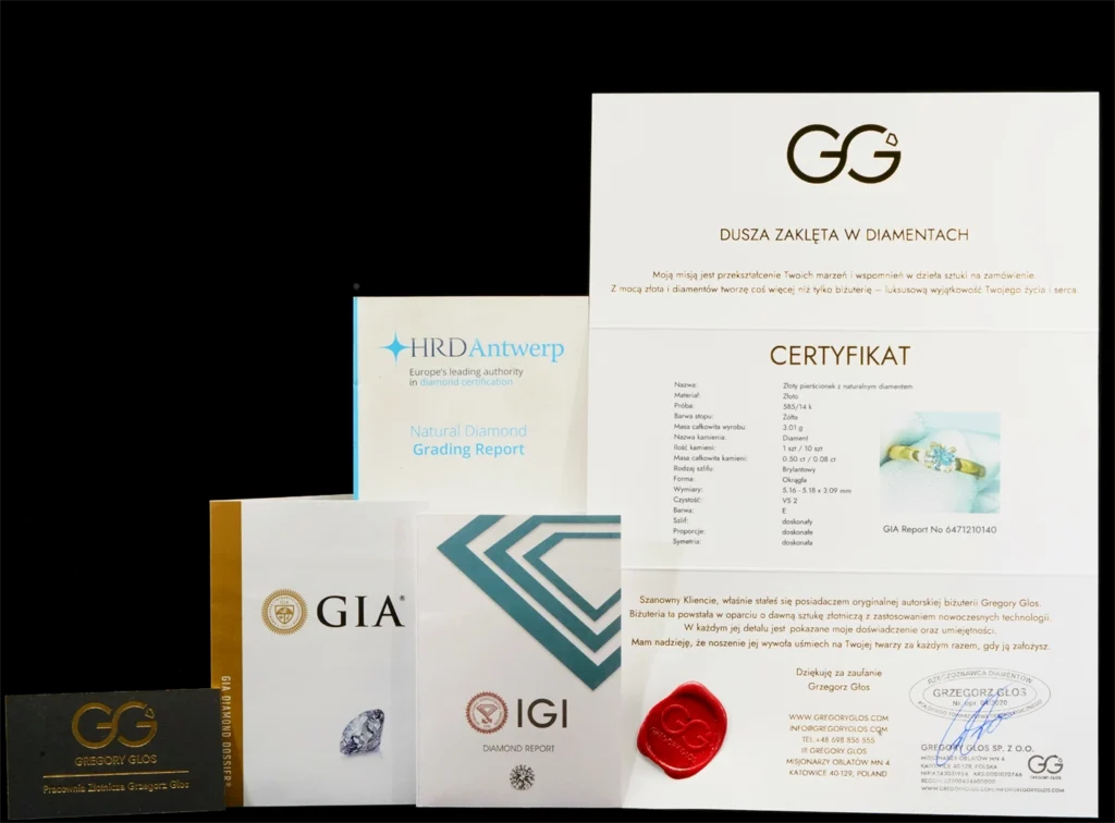 Każdy pierścionek i każda para obrączek, które opuszczają mój warsztat, otrzymują autorski certyfikat Gregory Glos, który tworzę specjalnie dla Ciebie. To potwierdzenie, że trzymasz w dłoni coś wyjątkowego, stworzonego z najwyższą precyzją, z pasji i szacunku do sztuki jubilerskiej. Mój certyfikat zawiera zdjęcie konkretnego egzemplarza, a także wszystkie istotne dane techniczne i szczegółowe informacje o kamieniach. Jeśli w biżuterii znajduje się diament o masie przekraczającej 0,30 ct, dołączam również certyfikat jednego z trzech najbardziej renomowanych instytutów gemmologicznych na świecie: